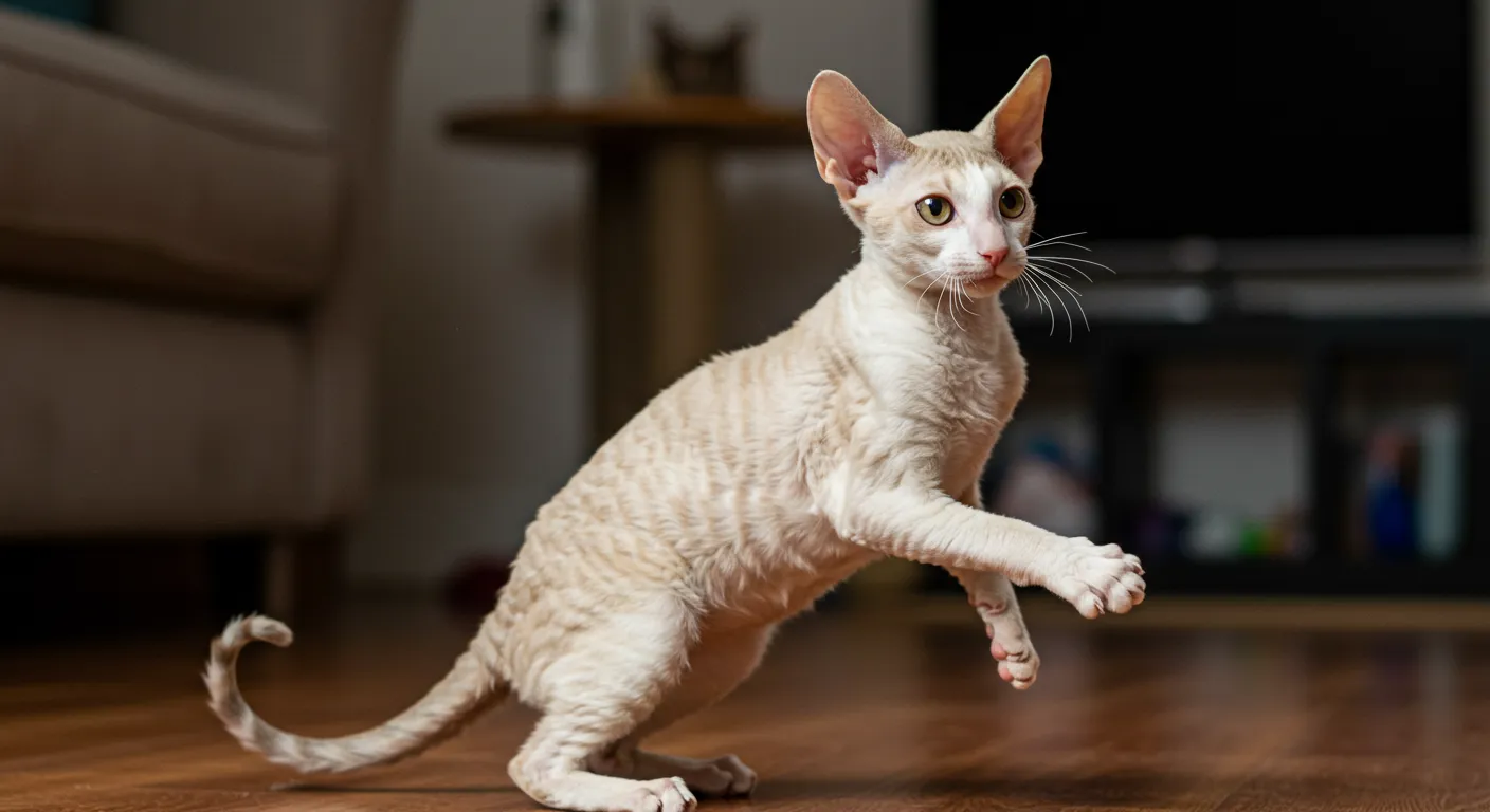 코니시 렉스는 곱슬거리는 짧은 털과 날씬한 몸매가 특징인 고양이야! 🐾 이 고양이는 마치 스프링처럼 점프를 잘하고, 에너지가 넘치는 장난꾸러기야.